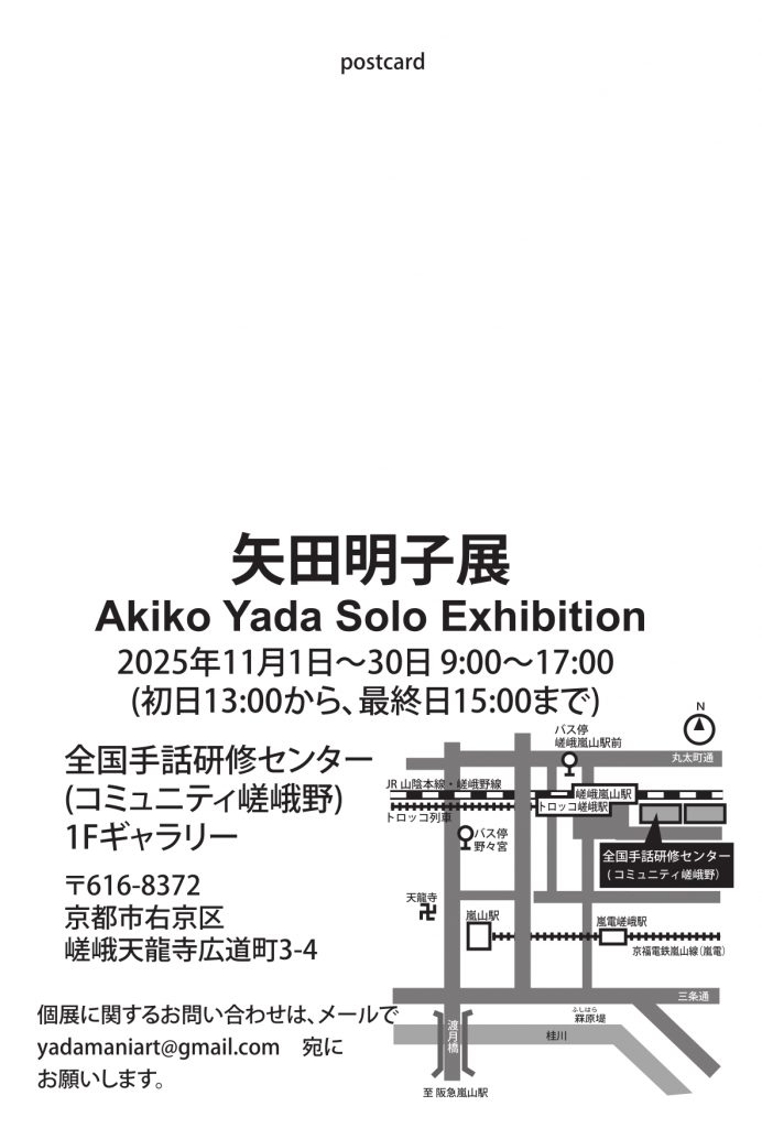 そして11月1日から11月30日までの1か月間、個展を開催します。今回は特にテーマはなく「矢田明子展」として開催します。こちらでは絵画を展示します。長丁場なのですべての日には在廊できませんが、休日を中心に在廊しようと思います。会場の全国手話研修センターはJR嵯峨嵐山駅からすぐの所にあるホテルの中にあり、広いカフェも併設しています。京都の一大観光地・嵐山に近いので観光がてらのお越しもお待ちしております。